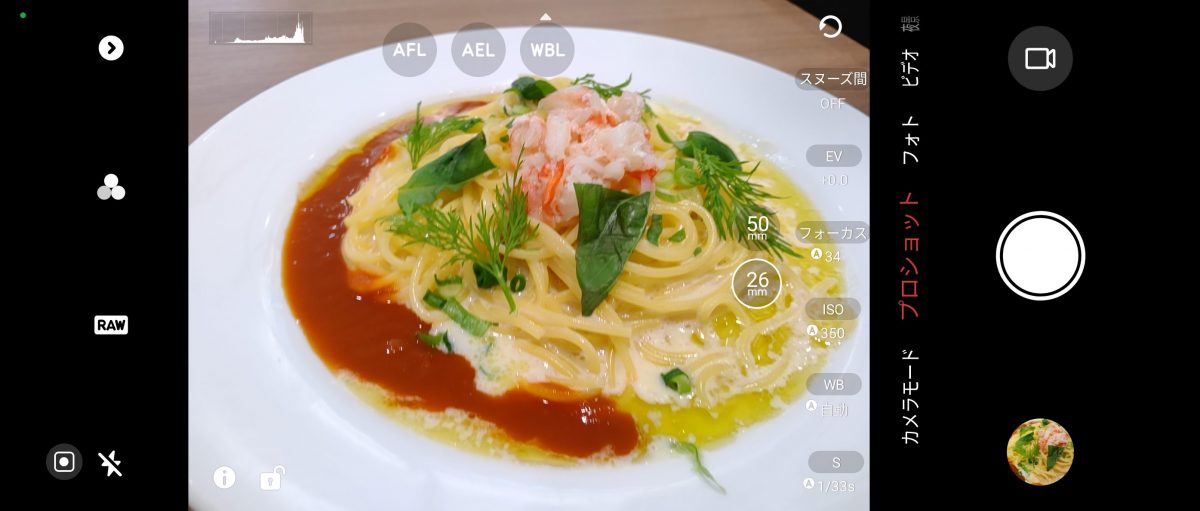 カメラアプリでは「メイン26mm」と「標準50mm」を画角で選べるようになっています。カメラ構成は広角5000万画素と、ぼかしを演出するための深度センサーという内容なので、実質的にはシングルカメラで切り出しズーム処理をしていることになるでしょう。