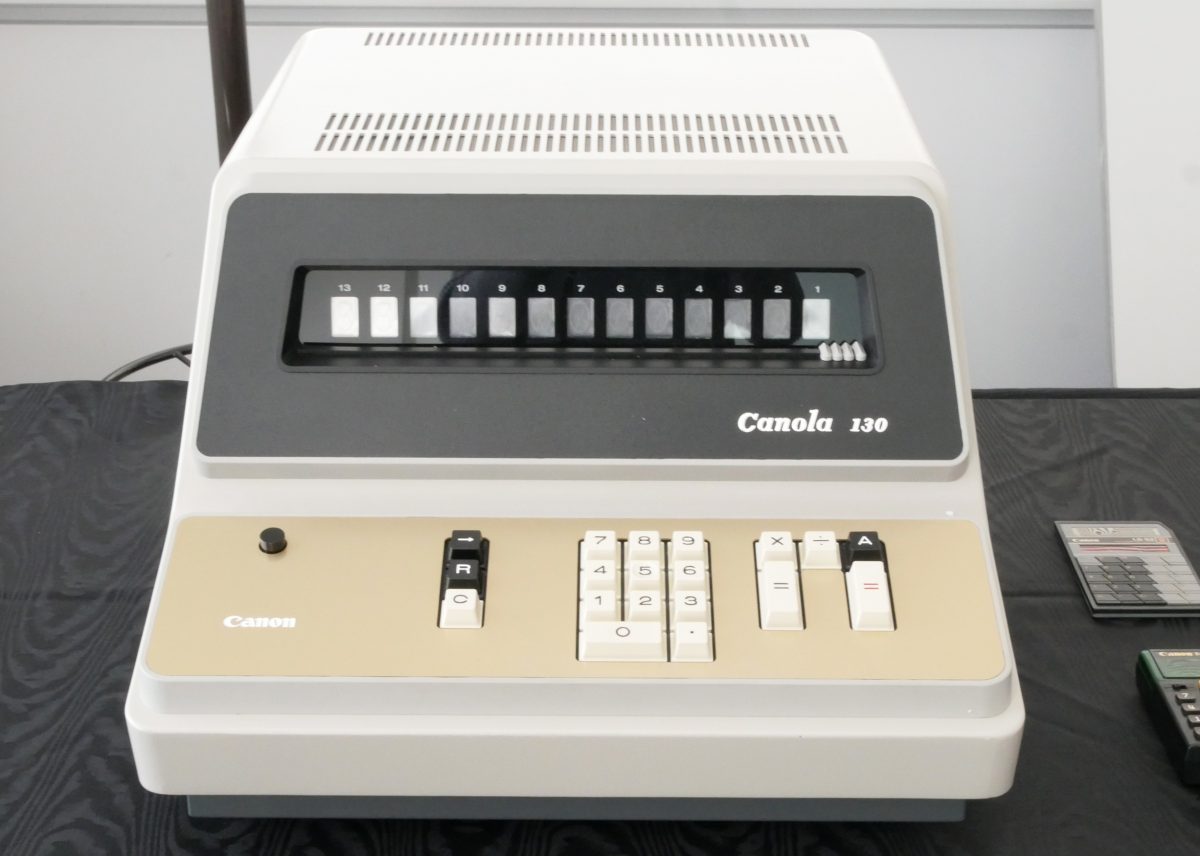 キヤノンの電卓の歴史は、1964年10月20日に発売されたキヤノーラ130から始まる。当時の計算機のほとんどは、各桁に0~9の10個のキーが並ぶ「フルキー式」だった。それを、キーの数を少なくして、より便利で手軽に操作することはできないだろうか、と開発されたのが、世界初のテンキー式を採用したキヤノーラ130。現在の電卓にテンキー式が採用されていることからも、同モデルがエポックメイキングな存在であることは明らかだ。