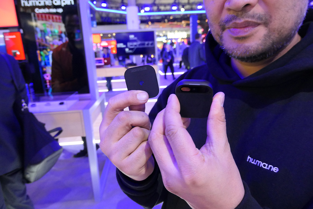 そんななかで、おそらく来場者から最も注目されていたであろうデバイスは、クアルコムのブースに展示されていた「AI Pin」です。アメリカのHumaneという会社が開発したウェアラブルデバイスで、ピンバッジのように衣服の胸あたりに装着し、主に声で操作する仕組み。小さいながらもマイク、スピーカー、カメラ、レーザープロジェクターなどを搭載し、クアルコム製のチップとeSIMが内蔵されています。