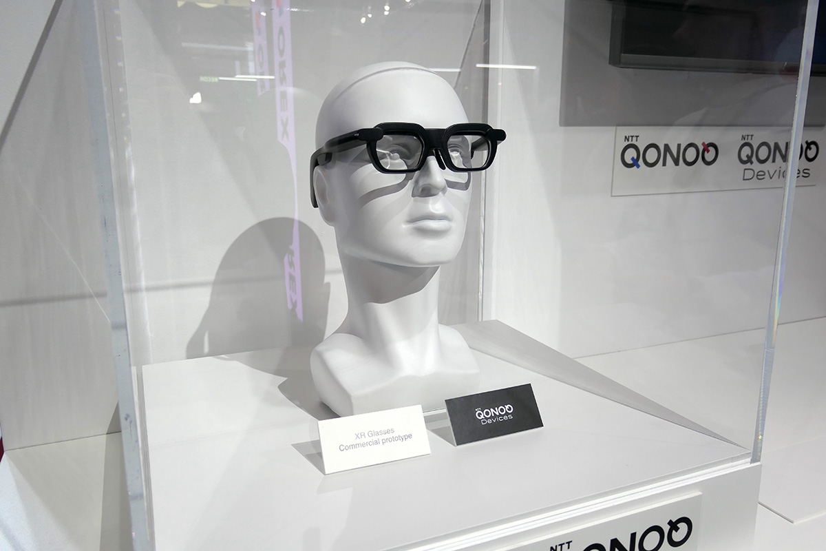MWCではメガネ型のスマートグラスの出展もありました。NTTドコモのブースには、ドコモの子会社でXR事業を手掛けるNTTコノキューがシャープと共同で開発したスマートグラスのプロトタイプが展示されていました。
