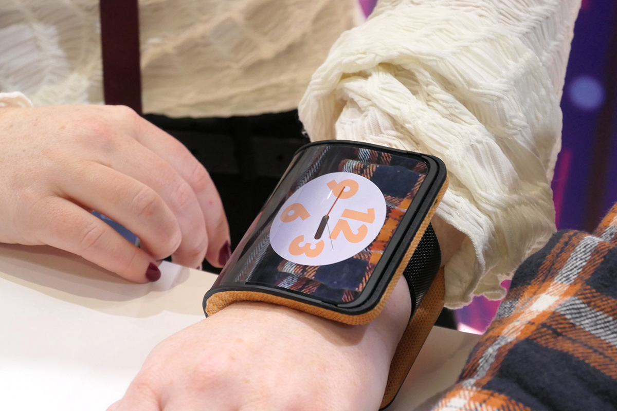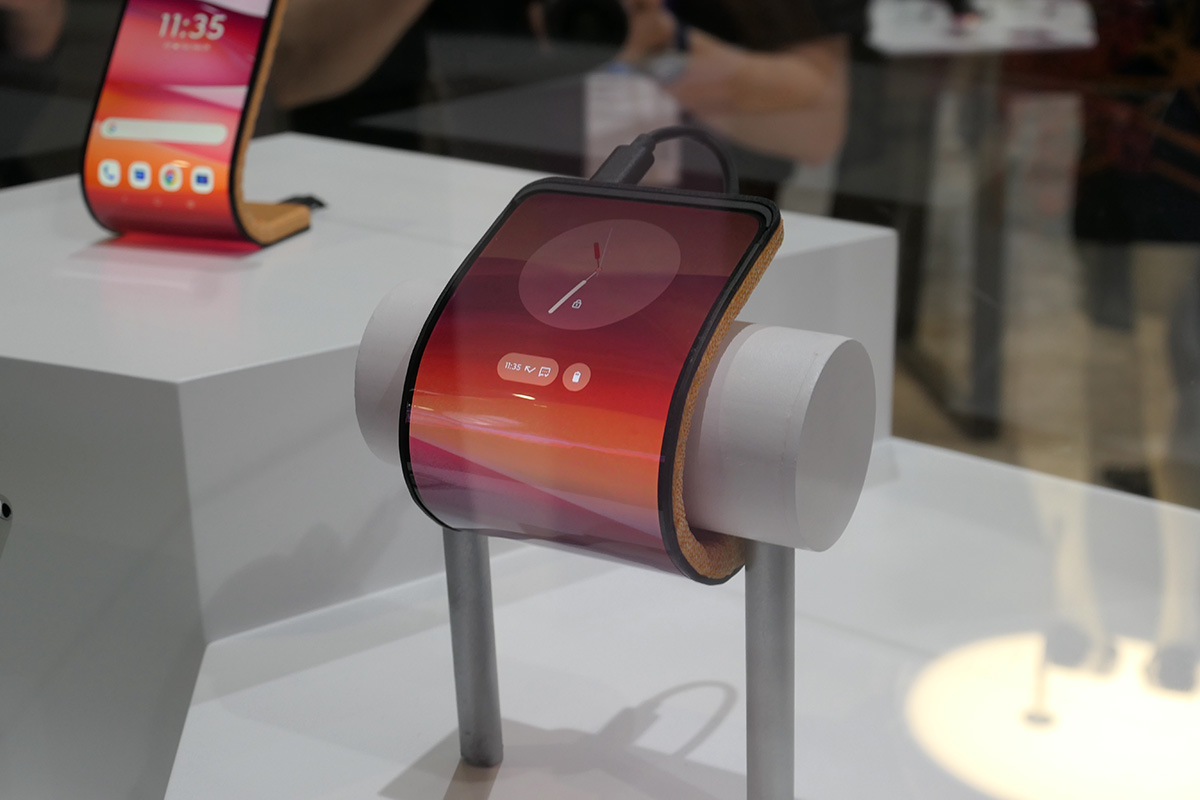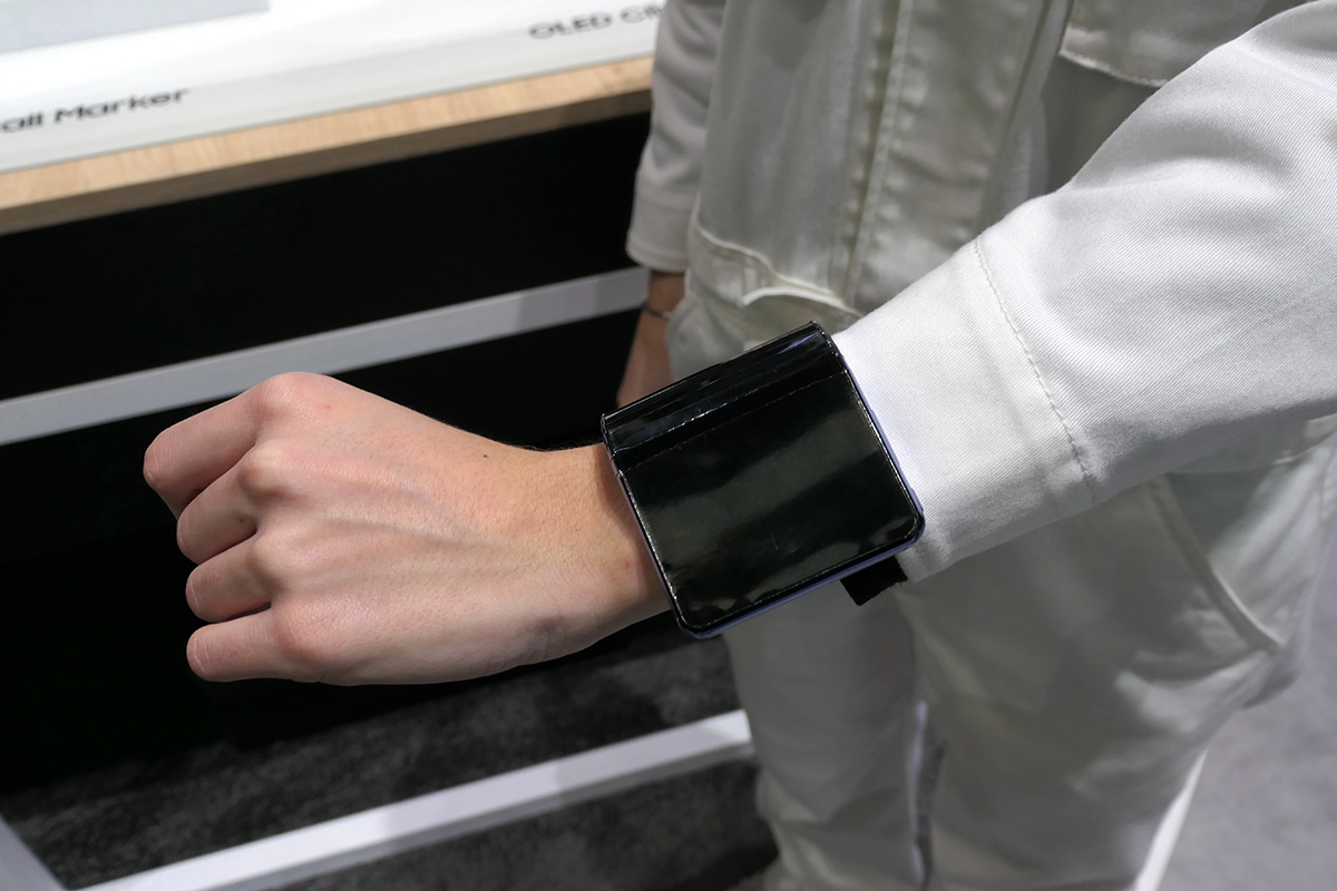 今回のMWCでは、モトローラが出展した、腕に巻くスマホのコンセプトモデルが注目を集めていました。「アダプティブ・ディスプレイ」と呼ぶもので、さまざまな形に折り曲げることができ、卓上に置いたり、棚などに引っ掛けたりして使うことも可能。サムスンディスプレイのブースにも同様のコンセプトの端末が出展されていました。