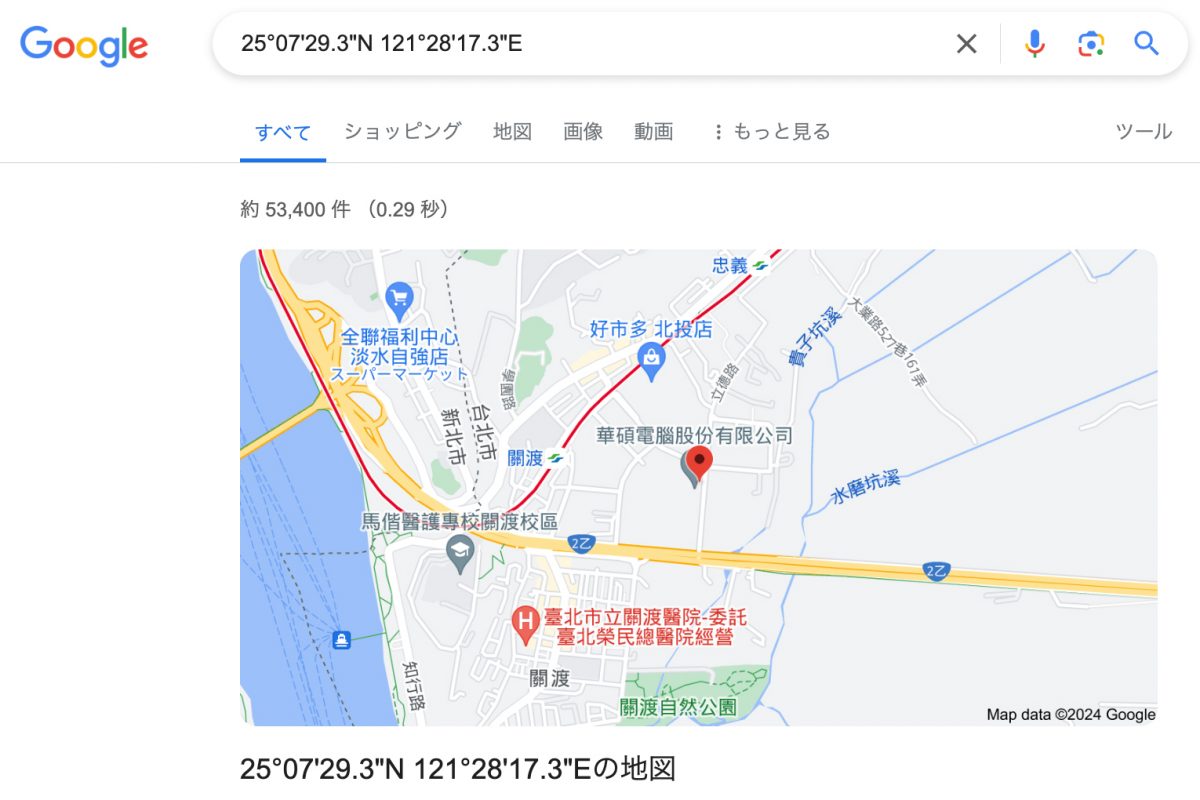 ちなみに、本体左下には薄い文字で「25°07’29.3″N 121°28’17.3″E」と北緯東経の座標が書かれており、何かを表しているのかと思い調べてみると……。