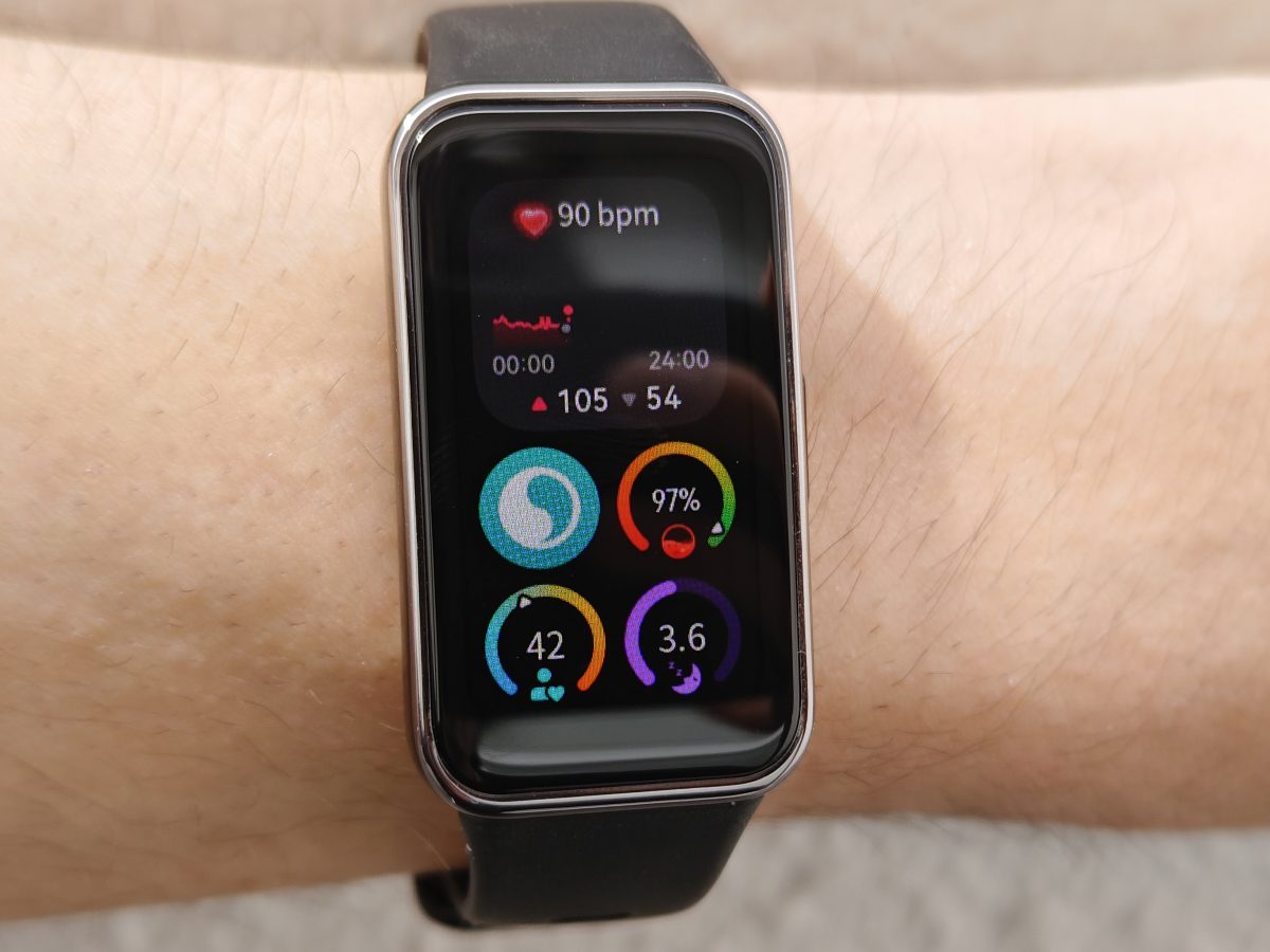 基本的な形状は前世代モデル「HUAWEI Band 8」を踏襲しています。スマートバンドにしては大きく、通知も見やすい縦長ディスプレイを搭載。
