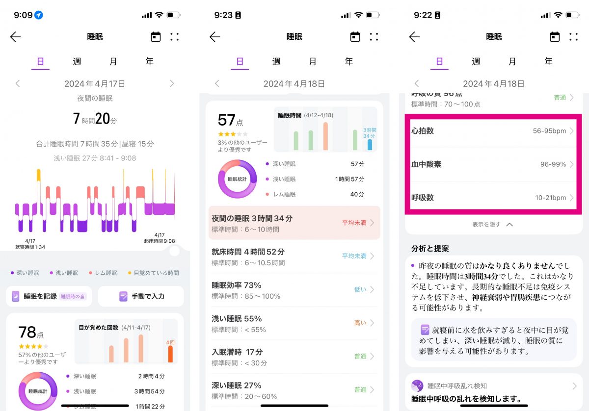 睡眠状態の見せ方は他社のスマートバンドと比べると分析結果の表示方法が洗練されている印象です。睡眠中に起こった状態の変化をグラフや文章などを使って丁寧に説明してくれます。新バージョンでは睡眠中の心拍数や血中酸素レベル、呼吸数などのデータが取得できるようになり、睡眠の質が良いのか悪いのかを判断する材料が増えました。