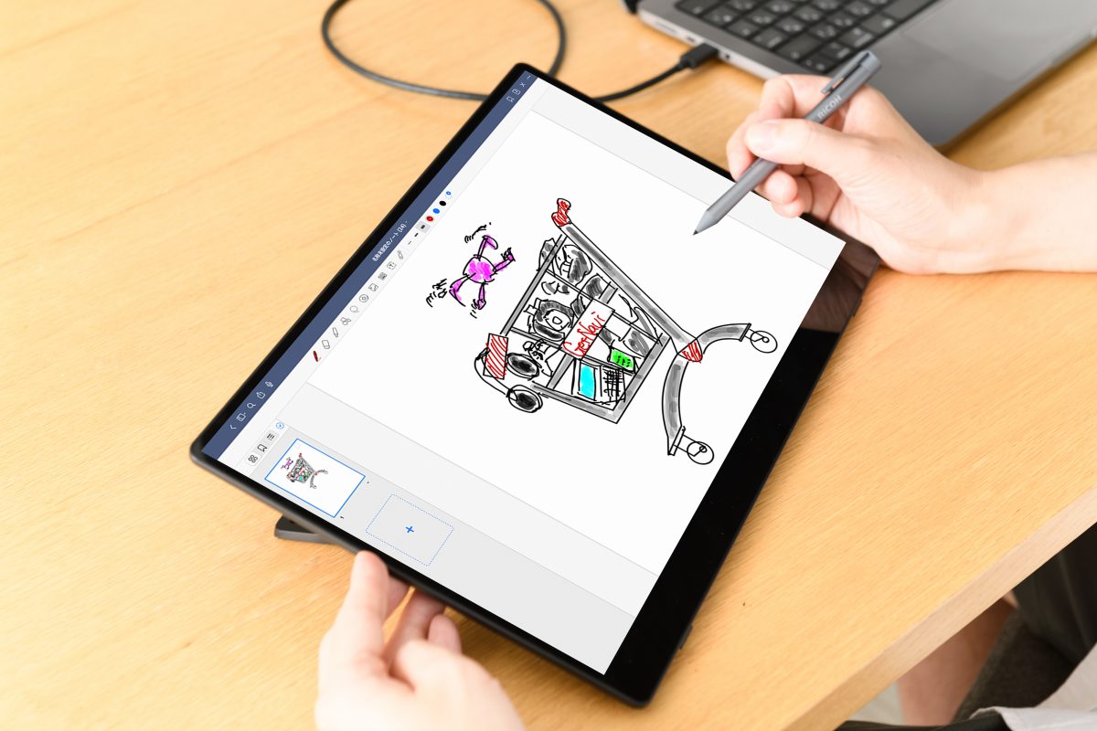 一方でプライベートの面では、軽量&大画面なディスプレイというだけでも充分活躍の機会がありました。イラストのような趣味の領域でも活躍できますし、かといって趣味だけではなくリモートワークのような仕事での領域でも活躍の場があります。一般的なタブレットはノートPCとの連携が難しく、趣味では活用できても仕事での使い勝手が難しい面もあったり。
