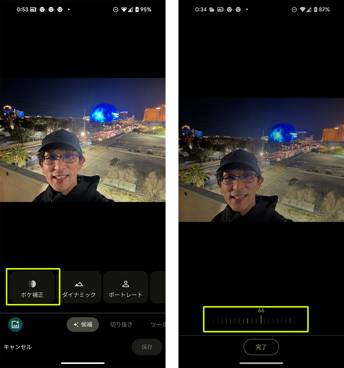 筆者がよく使う「ボケ補正」は、手ブレなどで精細感を欠いてしまった写真のディティールをAIと機械学習の力で直す機能です。夜景などは、撮影したその場で確認するとキレイに撮れているように見えても、PCに取り込んでみたら輪郭がぼんやりしていることがよくあります。そんなときに、フォトアプリの「編集」から「ボケ補正」を選ぶだけでシャキッとした写真になります。加工があまり不自然にならないように、補正レベルは0から100の間で細かく調整できます。