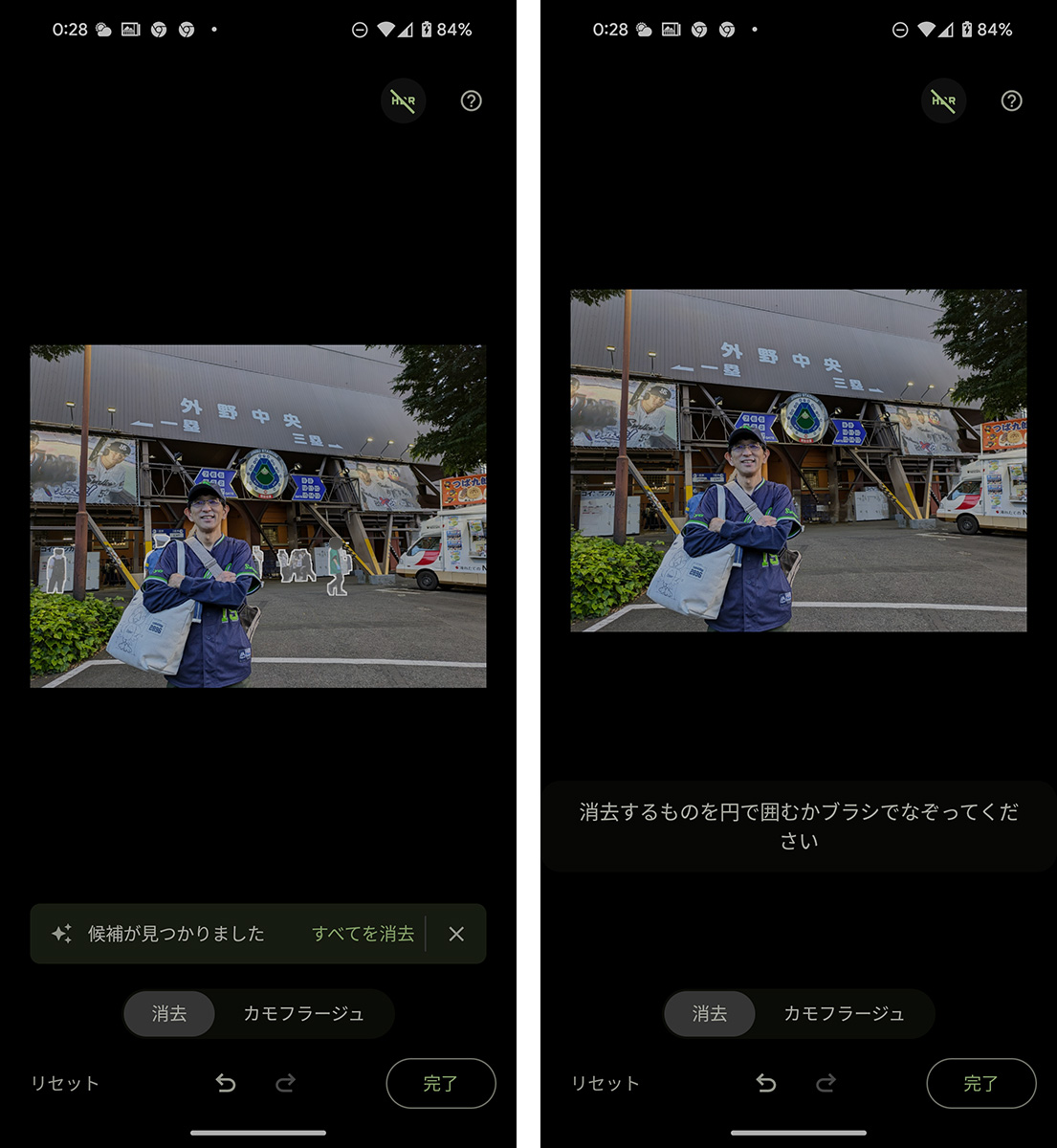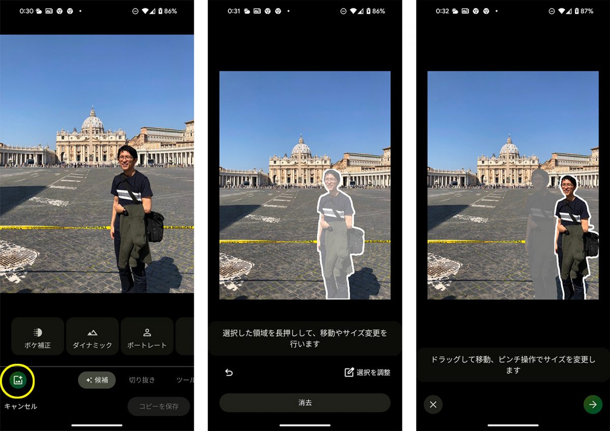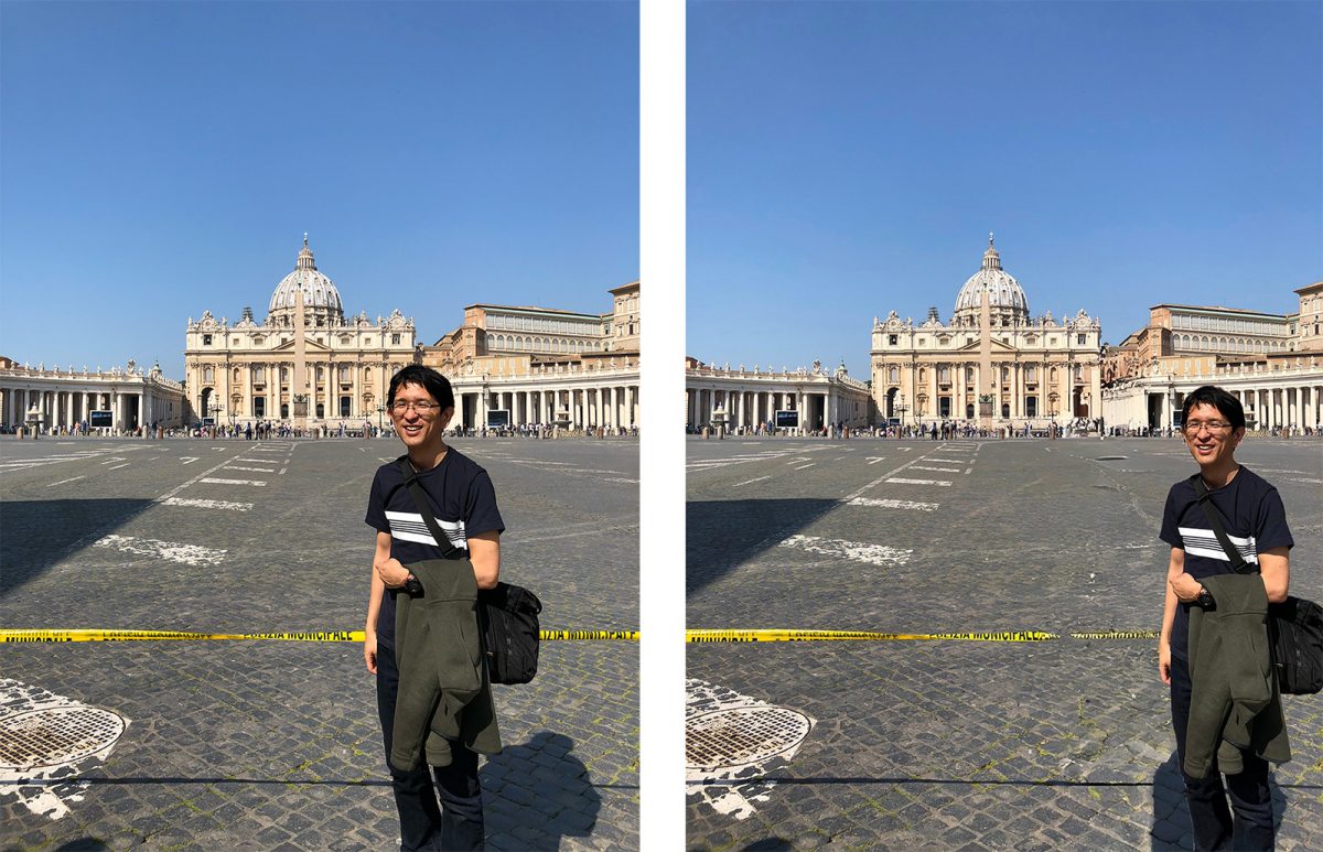 ただし、被写体を動かした元の場所にある画像はAIが機械学習によって復元してくれるのですが、建物などの場合は復元された画像が不自然になる場合もあります。あとで編集マジックを使う前提だとしても、自撮り撮影の際にはプレビューチェックを欠かさないようにしましょう。