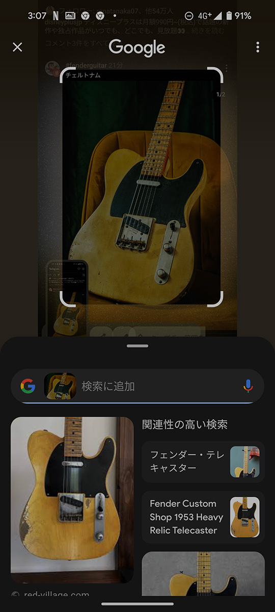 カメラ系以外のGoogle AI機能の中では「かこって検索」が便利です。Pixel 6以降のモデルや、サムスンのGalaxyシリーズの一部機種などが対応しています。たとえば誰かがSNSに投稿したギターの写真にグッときたときも、画像を「かこって検索」すれば即座にWebで検索したり、取り扱っているショップを調べたりすることができます。