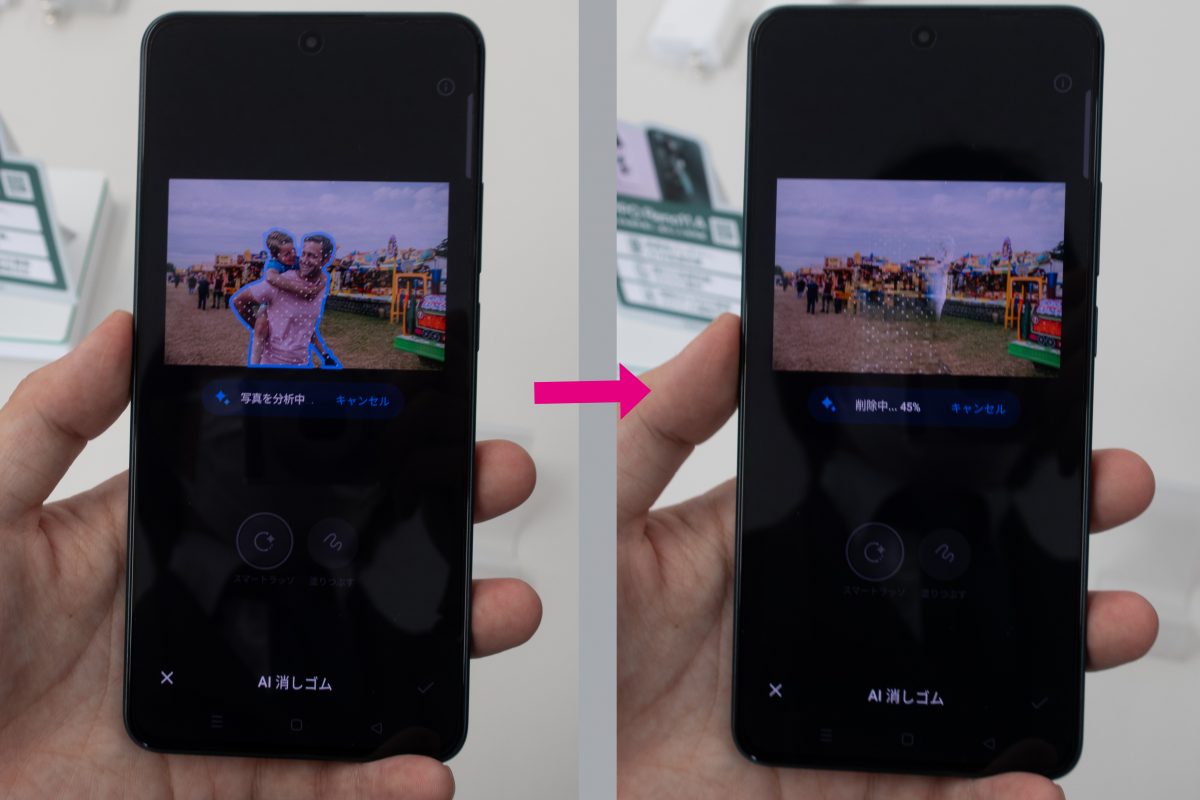 「AIクリッピング」という機能で、Google Pixelの消しゴムマジックのように、選択した部分の一部を写真から削除して、何もなかったかのように埋め合わせることができます。