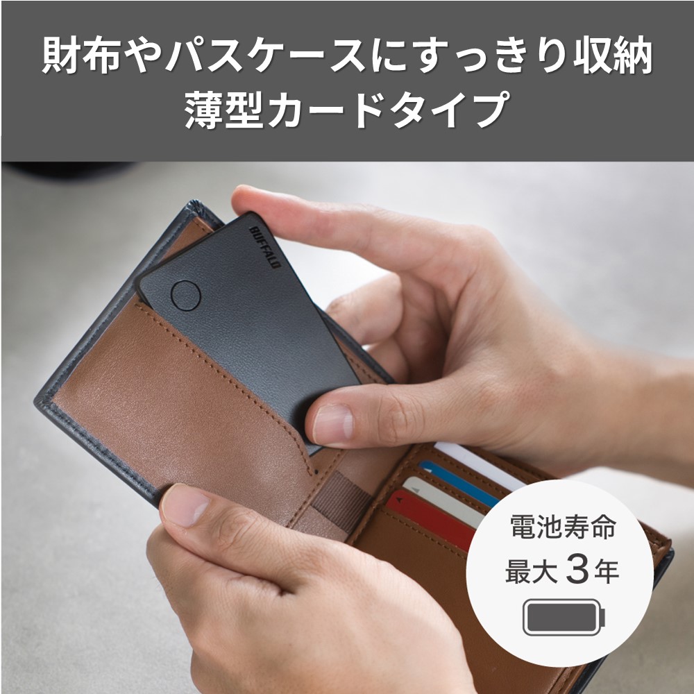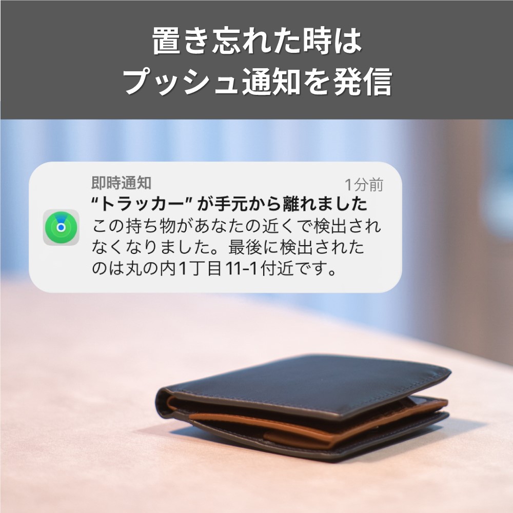 本商品はiPhoneやiPadの「探す」アプリを利用し、位置を確認できるスマートトラッカー。財布やパスポートケースのカードポケットに収めやすい2.4mmの薄型カードタイプで、大切な物の置き忘れや紛失を防止できます(※1、2)。