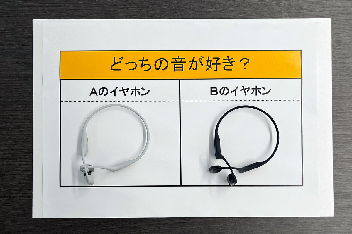 テストではイヤホンの詳細は明かさず、A、Bの2つの骨伝導イヤホンを聴き比べてもらい、好きな音のほうに投票してもらいます。ちなみにAが新モデルのOpenRun Pro 2、Bが従来モデルのOpenRun Proです。