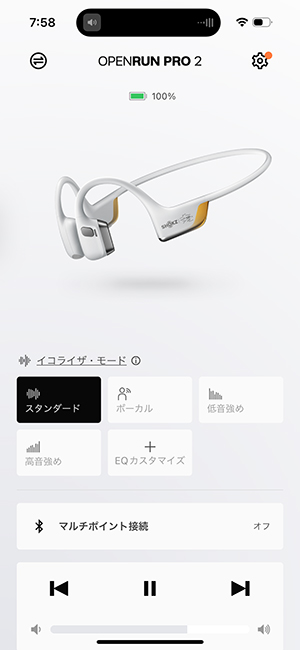 また専用の「Shokzアプリ」を使えば、4つのプリセットEQ(「スタンダード」「低音強め」「ボーカル」「高音強め」)と2つのカスタムモードで音質を好みに合わせて調整できます。運動中は「低音強め」でビートを強調してリズミカルに、通話時は「ボーカル」にして声を聴き取りやすく、などシーンに応じて使い分けるとよいでしょう。