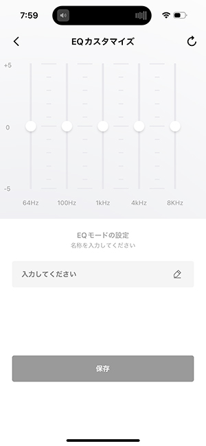 カスタムモードでは5バンドでそれぞれ±5の調整ができるので、プリセットの「低音強め」よりは少し低音を抑え目にして高域も上げたい、といった微妙な音質調整もできます。カスタムモードは2つまで登録しておけるので、微調整をしながら好みの音を探してみましょう。