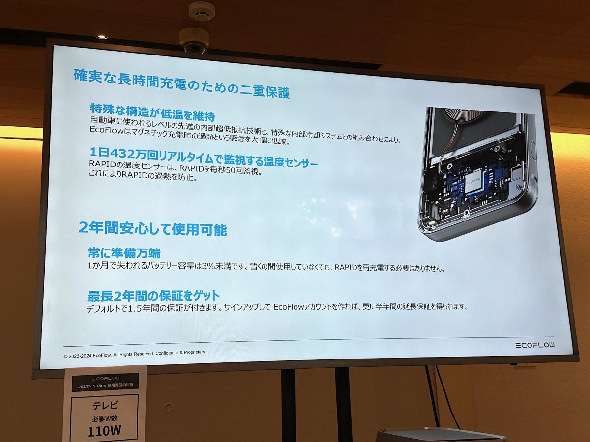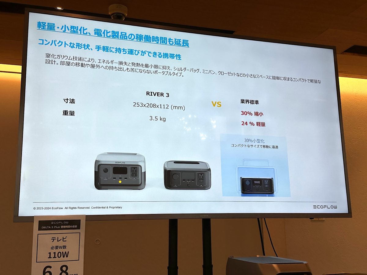 続いて発表されたポータブル電源RIVER 3は、「RIVER 2」シリーズからアップデートした最新モデルです。約255×207×113mmで、業界平均より30%小さく、最大出力は300Wで、子どもや女性でも気軽に持ち運べる手軽さとパワフルさを誇ります。EcoFlowのX-GaNPower(窒化ガリウム)技術を採用したRIVER 3は、GaN半導体材料を利用した初の高効率で、100W未満の電化製品で稼働時間を最大81%延長可能です。