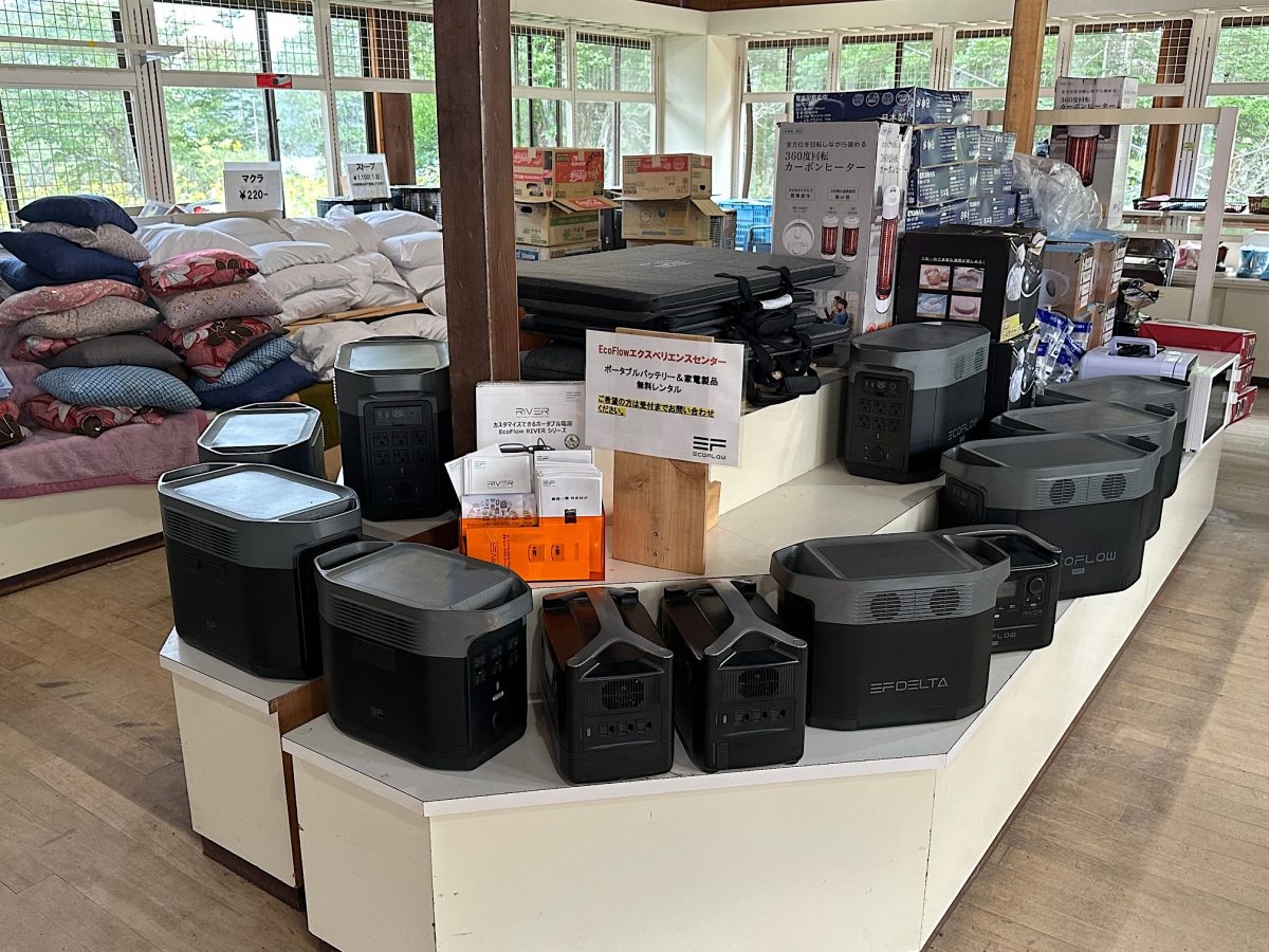そのため菅沼キャンプ村では、「EcoFlow エクスペリエンスセンター」が開設され、EcoFlowのポータブル電源が貸出機材として用意されており、無料で借りて試すことができます。大容量の「DELTA Max」から、比較的小容量の「RIVER Max」「RIVER Pro」まで取り揃えられており、用途に合わせて選択可能。ソーラーパネルも用意されており、ポータブル電源と組み合わせて使用できるようになっています。このEcoFlowのポータブル電源を貸し出すという取り組みは、今年で4年目を迎えます。