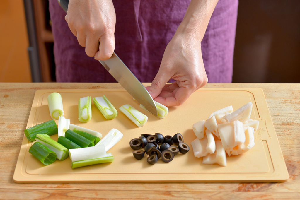 1.長ねぎは5㎝幅に切ってから、縦に2等分にする。レンコンは皮をむき、串切りにする。アンチョビは粗く切り、黒オリーブは2等分に。