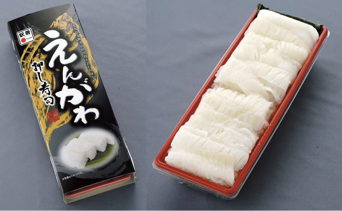 いま駅弁業界で最も話題なのがえんがわ寿司。創業明治30年の神尾弁当の商品は、特製の甘酢で締めたカレイのえんがわを酢飯と合わせて押し寿司に仕上げた。甘味のあるえんがわの脂は酢飯と相性抜群。