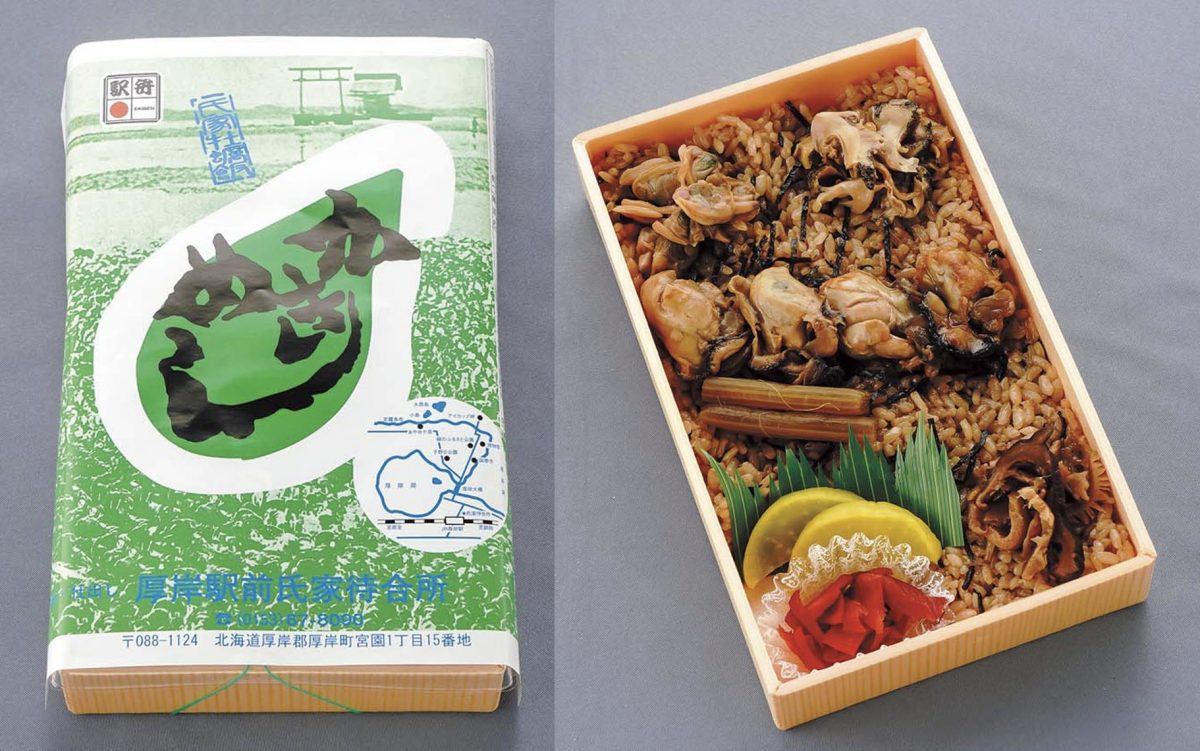 根室本線厚岸駅の前にある氏家待合所で販売している厚岸名物。牡蠣などの煮汁とひじきで炊いたご飯に、じっくり煮込んだ牡蠣やツブ貝、アサリ、フキ、シイタケなどを盛り付けている。