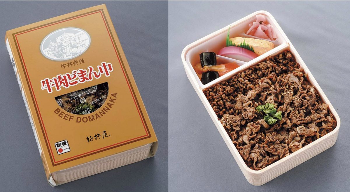 山形新幹線開通にあわせて発売された大人気駅弁。名称の由来になった山形県産米「どまんなか」に、甘辛いタレで煮込んだ牛そぼろと牛肉をたっぷりのせた。小芋煮や昆布巻きなどのおかずも上質。