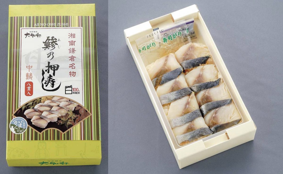 100年以上にわたり愛されている鎌倉名物。伝統の合わせ酢で締めた鯵は肉厚で食べ応え十分。握り寿しを箱に詰めてから専用の型で押す、独自の製法で食べやすくおいしい押し寿司に仕上げた。