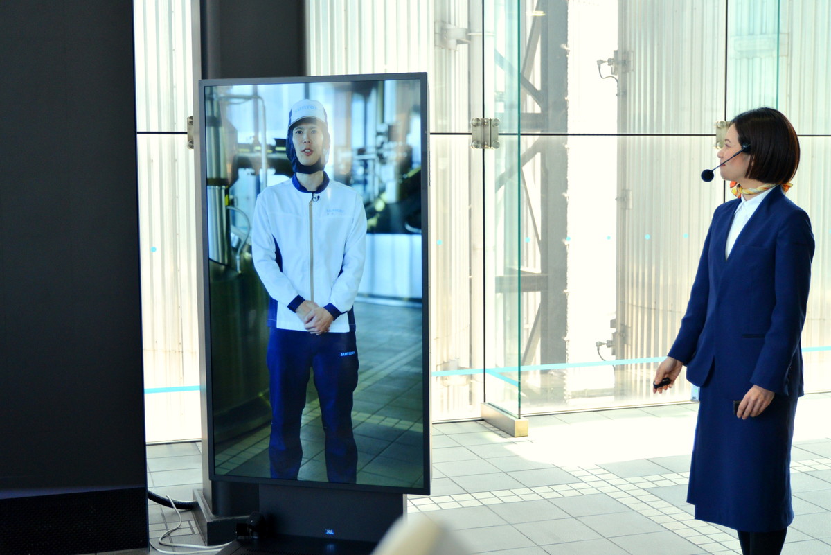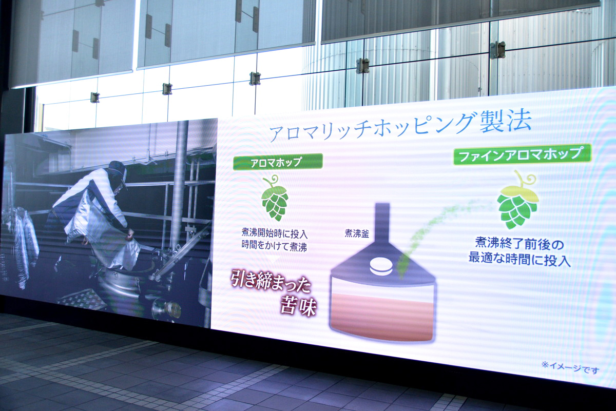 次はパネルのすぐ先にある、横幅約7.5メートルの大型モニターの前へ移動。これも新設されたものとなっており、“仕込”工程についてのムービーを視聴します。なお、製造工程の説明に加えて、つくり手が映像で登場するのもポイント。こちらは京都工場だけの見どころのひとつとなっています。これは「つくり手等身大モニター」と呼ばれ、ビールづくり細部へのこだわりを、つくり手の等身大映像を使ってリアルに伝えるもの。