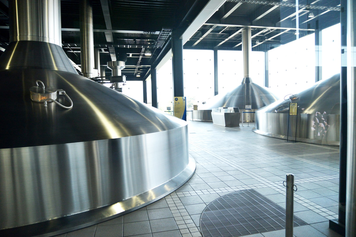 大型モニターのすぐ後ろには巨大なガラス張りの仕込室があり、ここで実際の仕込に使われるタンクを見学。天然水と麦芽を混ぜ合わせ、でんぷんから糖へ分解して麦汁の素をつくる「仕込層(マッシュタン)」、麦汁のもとを煮出してビールの味に厚みをつける「仕込釜(マッシュケトル)」、麦芽の殻を取り除く「濾(ろ)過槽(ロイタータン)」、煮沸してホップ由来の香りや苦みを付与する「煮沸釜(ワートケトル)」、煮沸が終わった麦汁のなかの不要物を取り除く「沈殿槽(ワールプール)」がそれぞれ配置されています。
