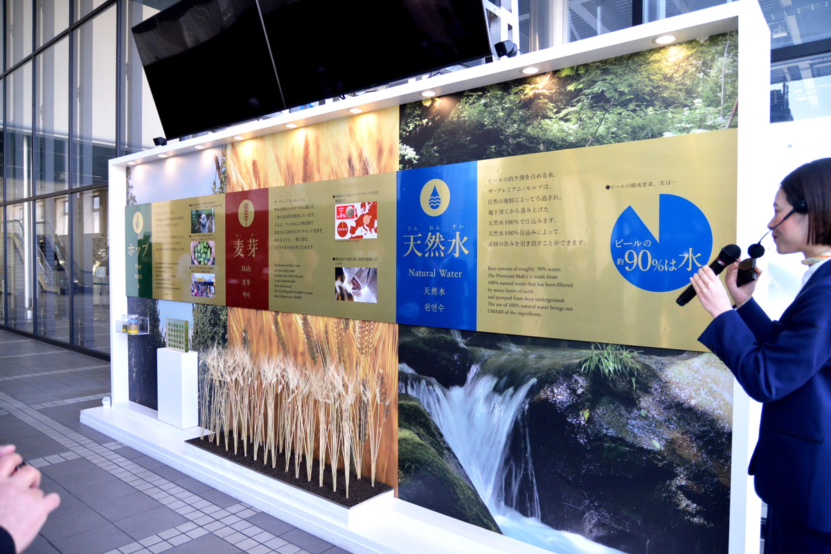 パネルには実際に醸造で使われている麦芽とホップも展示され、ホップは香りをかぐことができます。ちなみに、「ザ・プレミアム・モルツ」で使われているのは、欧州産の希少で硬い「ダイヤモンド麦芽」と、チェコ・ザーツ産の香り高い「ファインアロマホップ」です。