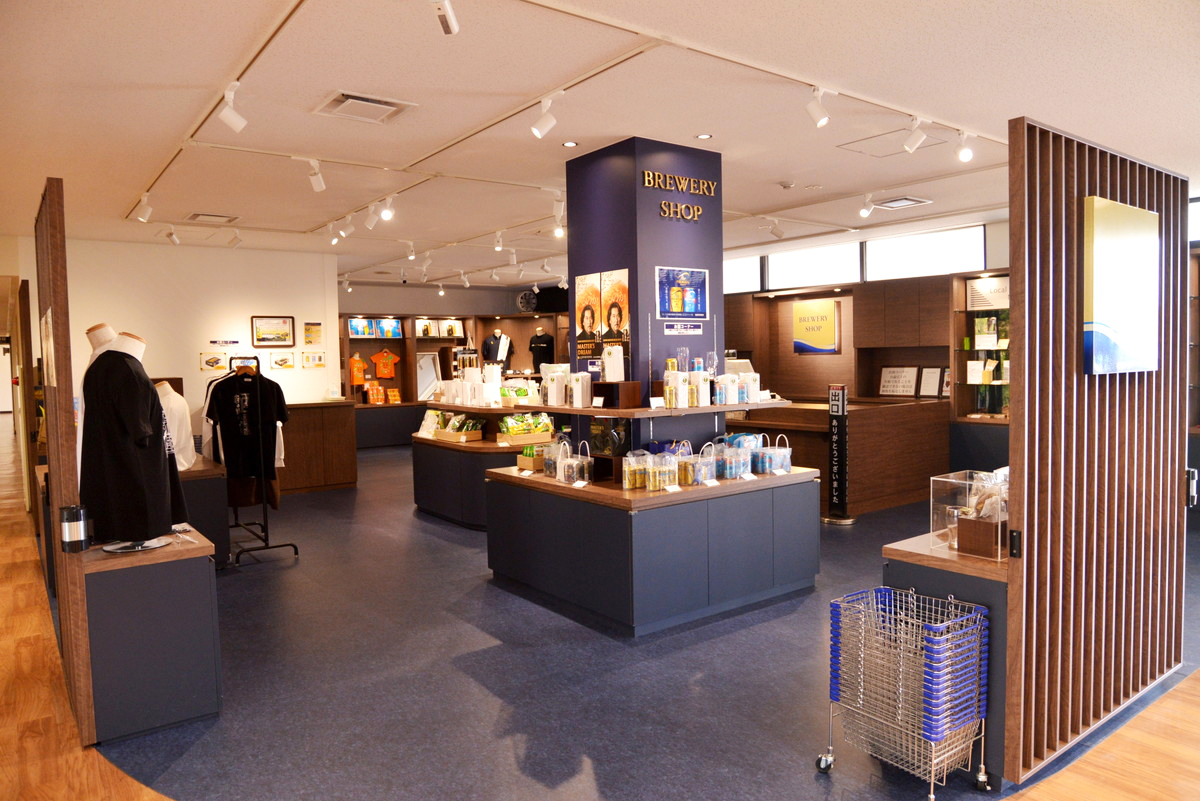受付やゲストルームがある建物には、入口すぐの場所に「ブルワリーショップ」が併設されているので、お土産はここでゲットしましょう。京都工場にしかないロゴグラスや、タオル、アパレルなど、限定品もたくさんあります。