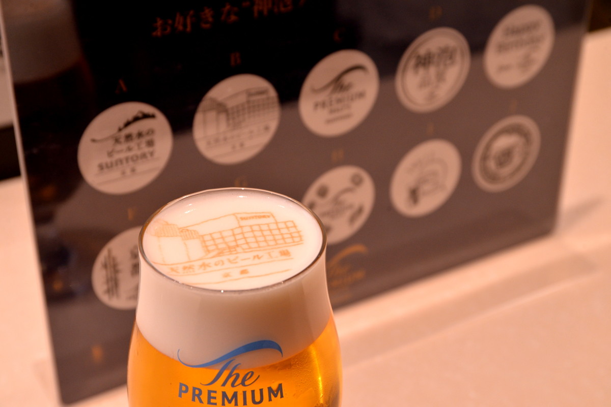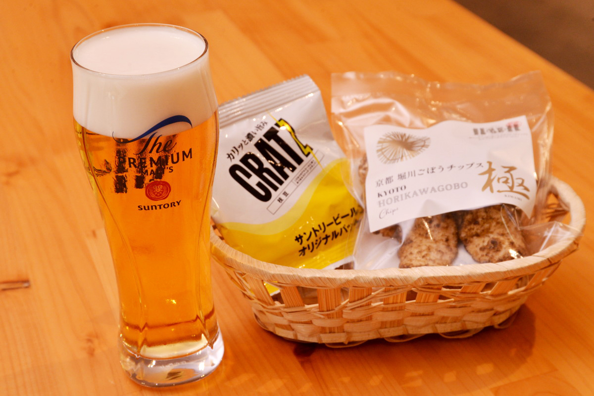 京都工場ならではのおもてなしとしては、オリジナルデザインが描かれたグラスや、京野菜を使ったおつまみ「京都 堀川ごぼうチップス」などを用意しているのがポイント。また、特別な機械で泡の表面に描かれる「神泡アート」も、独自のデザインが用意されています。