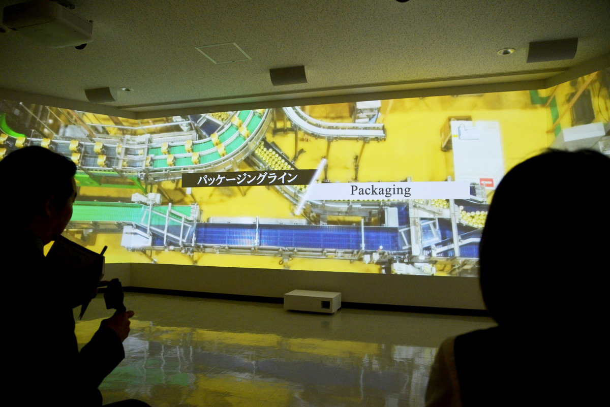 その後は新しく加わった品質管理についての紹介を見学。醸造されたビールは缶と業務用の樽に詰められ、缶は箱へと梱包されていきます(パッケージング)。ここでは三面からなる横長の大型スクリーンで流れを詳しく学び、その後は実際にフィラー(充填機)などが稼働している部屋を見学できます。