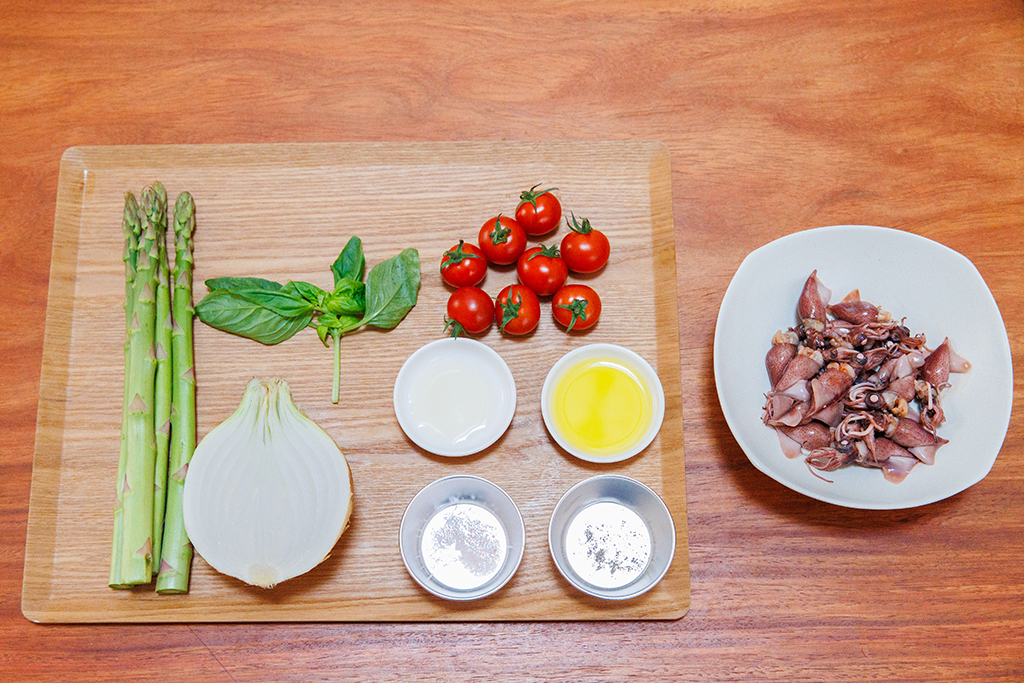 1.アスパラガスは根本から1cmほどの固い部分を切り落とし、根本から1/3ぐらいまで皮をむく。長い状態のまま塩茹でし、ザルにあげる。ホタルイカは目と口をピンセット等で取り除く。