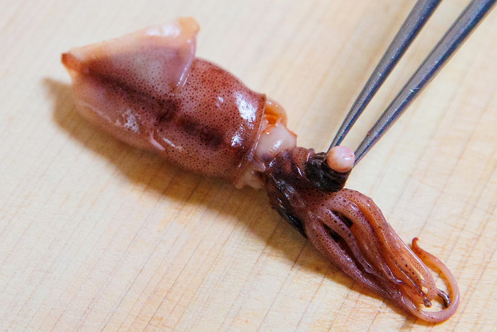 「ホタルイカならではの食感をしっかり楽しむために、口に残りやすい“目”と“口”を、ピンセットなどで丁寧に取り除きます。
