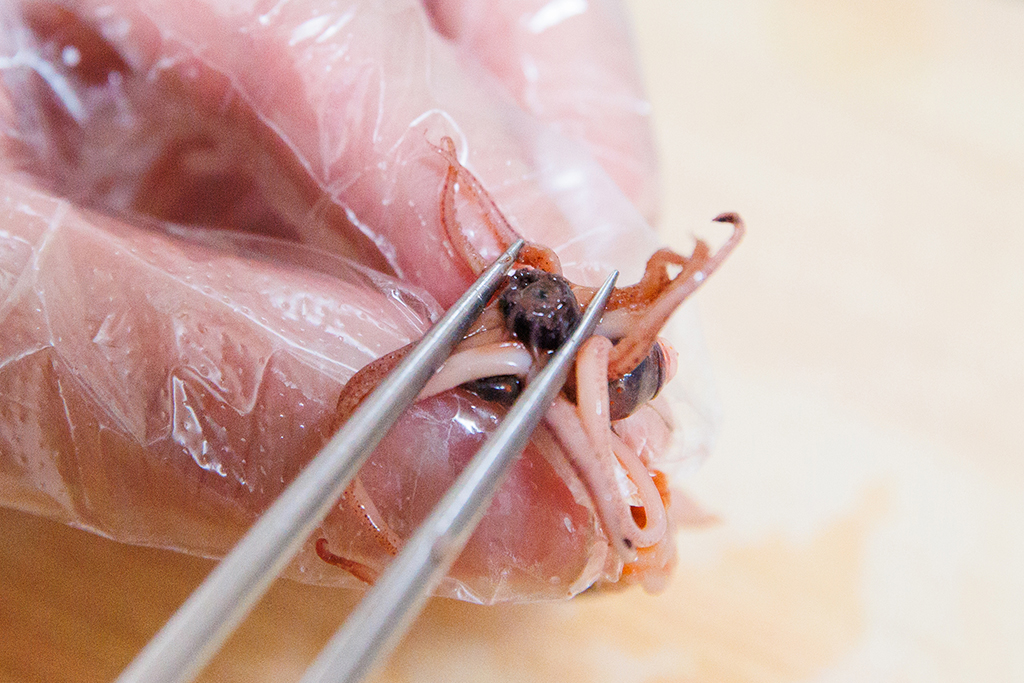 げそを広げて、中にある茶色く硬い口をピンセット等で除去する。