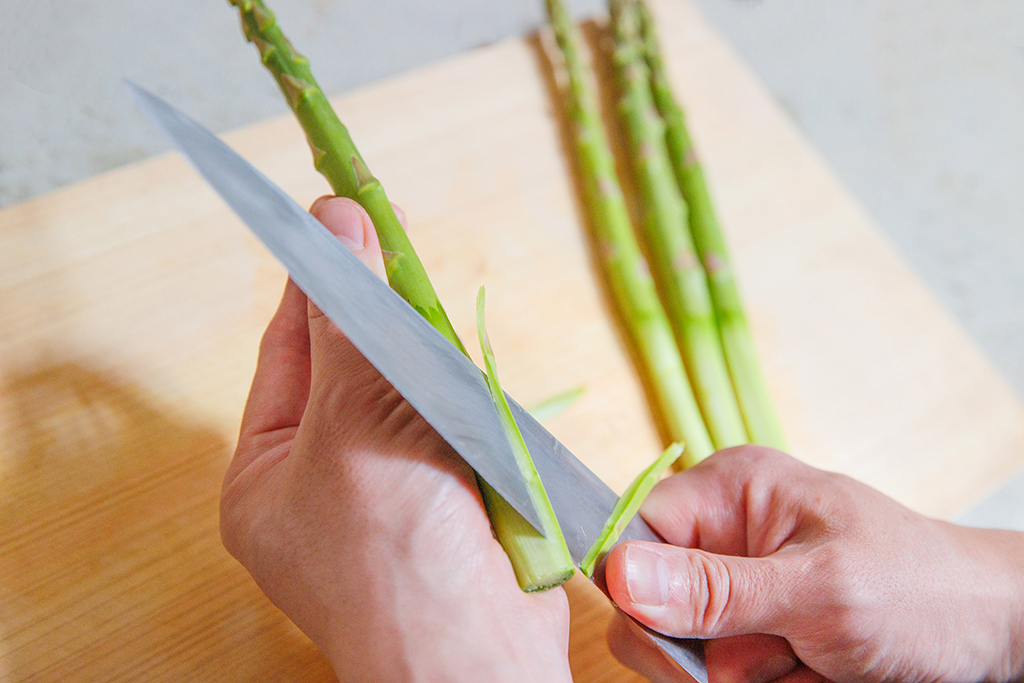 「アスパラガスの下1/3ほどの皮は繊維質で固いため、皮をむいておくと、歯ざわりがよくなります。また、菜の花と同様に、軸と穂先では火の通りが異なるため、軸からお湯に入れるのがポイント。アスパラガスがまるごと入る大きさの鍋を用意しましょう」
