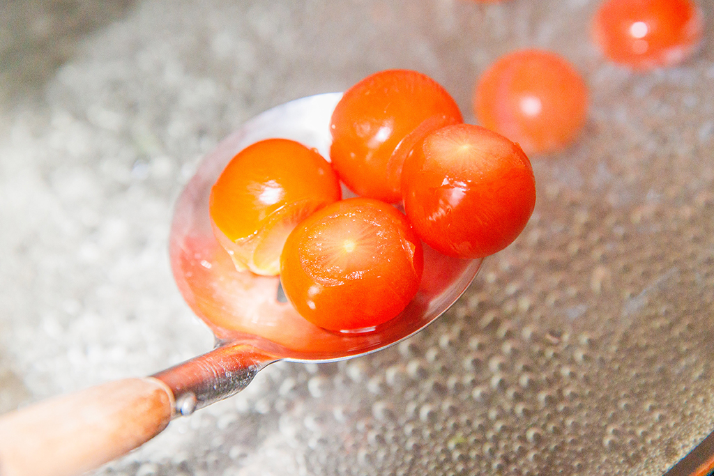 「ミニトマトは、湯むきしやすくするための下ごしらえとして、包丁でヘタと一緒に上部を少し切り落とします。切ったミニトマトを沸騰したお湯にさっと入れ、皮がめくれてきたら取り出してOK。火を通す必要はありません」