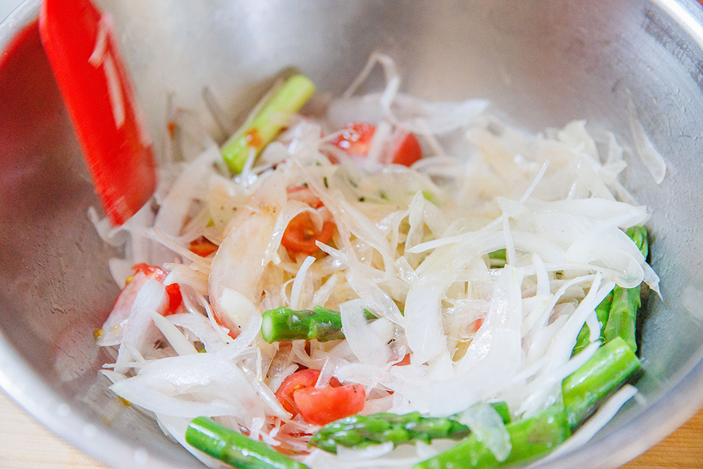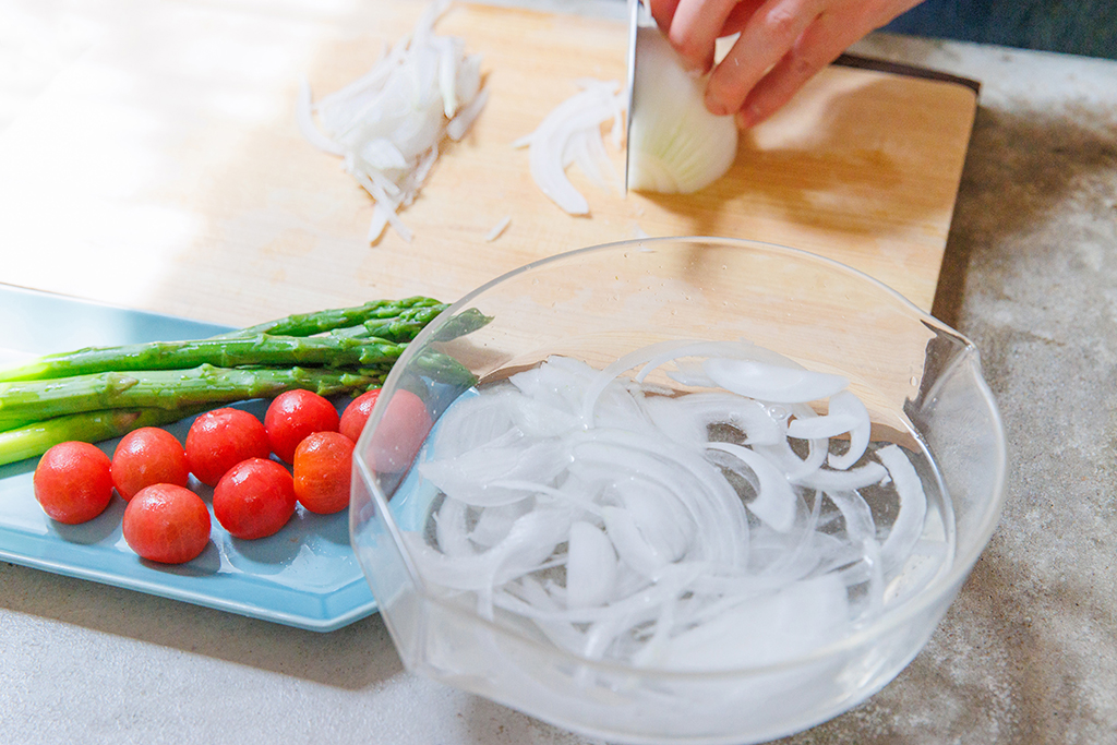 3.新玉ねぎは薄切りにし、水にさらす。アスパラガスは3cmぐらいにカットする。