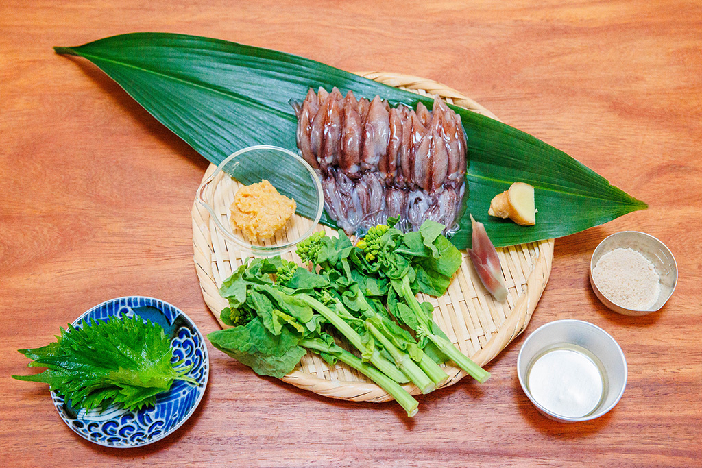 「肝ごと味わうホタルイカは、旨みだけでなくほろ苦さや甘味も楽しめるのが魅力。そんな個性ある味わいは、同じくほろ苦さがおいしい菜の花と相性抜群です。