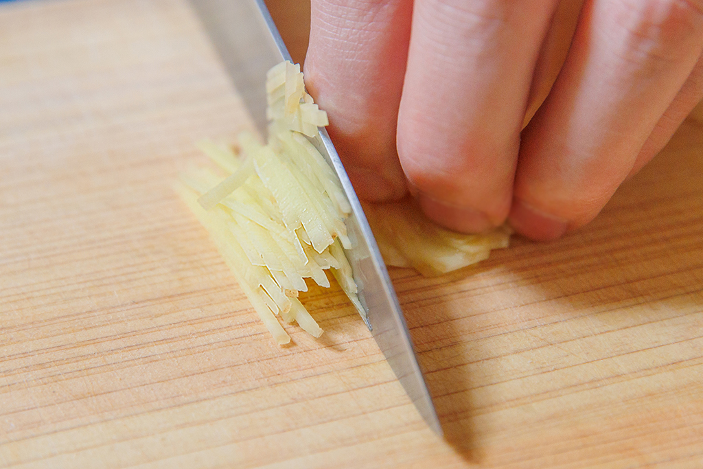 「後ほどご飯に混ぜこむため、限りなく薄く細く刻みましょう」