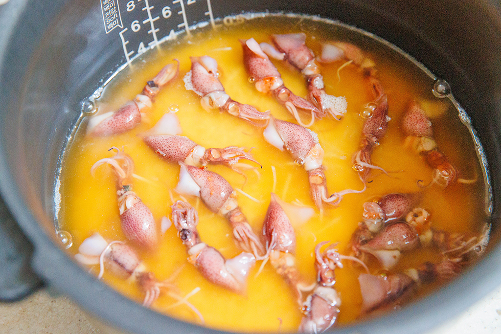 4.ホタルイカと千切りした生姜を米の上に乗せ、炊飯する。