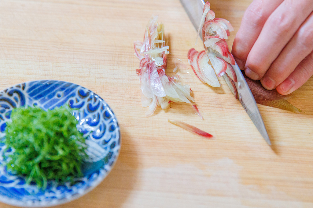「大葉を千切りにするときは、葉を重ねて中央の葉脈に沿って縦半分に切ってから、くるくると巻いて刻むと切りやすくなります。大葉もみょうがも、できるだけ薄く、細く刻むのがポイント。どちらもアクがあるため、刻んだあとは必ず水にさらしましょう。酢味噌ソースには、すりおろし生姜を加えることで、風味がぐっと引き立ちます」