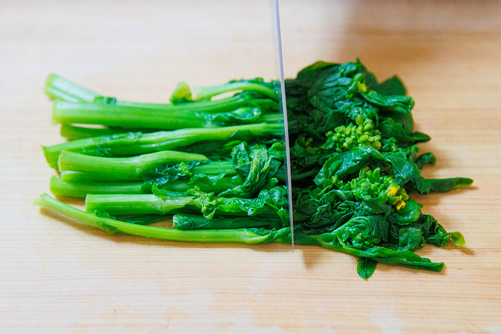 「菜の花は、茎と葉で火の通り方が違うため、茎だけをお湯に浸たし20秒ほど待ってから、全体を沈めさっと茹でます。仕上げに酢味噌ソースをかけ、冷蔵庫で30分ほどなじませると、より一層おいしくいただけます」