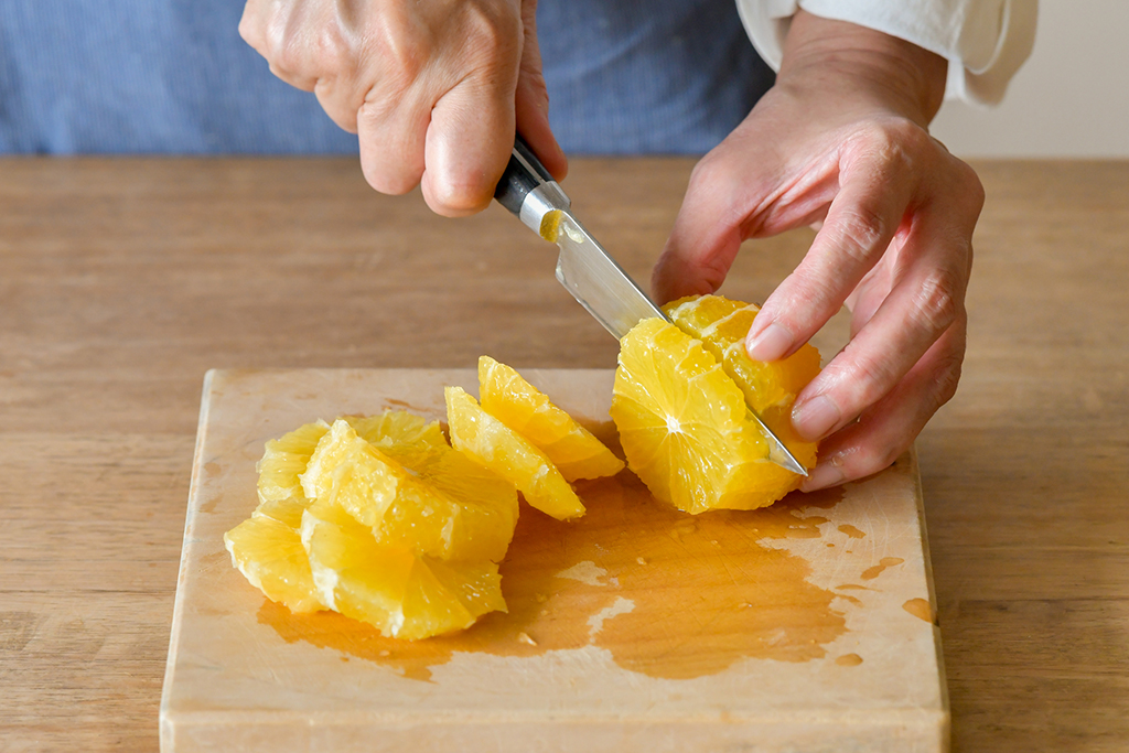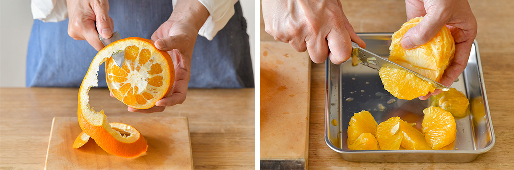 「果物ナイフで甘夏の皮を厚めにむいて、白いワタまで取り除きましょう。外皮をむき終わったら、小房の薄皮と果肉の境目にナイフを入れ、薄皮をむくようにして身を取り除きます」