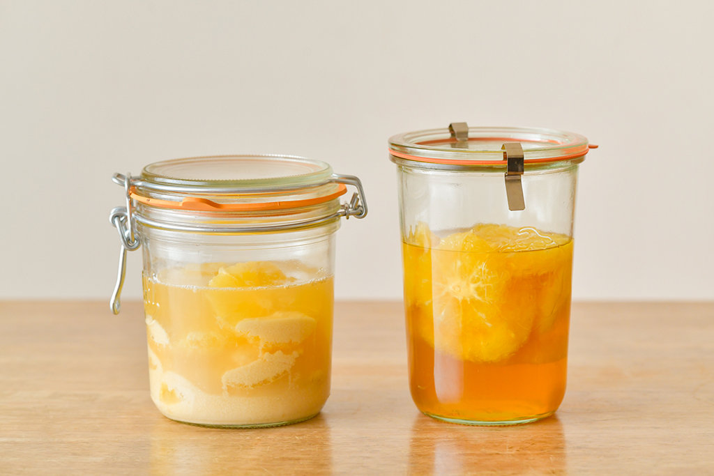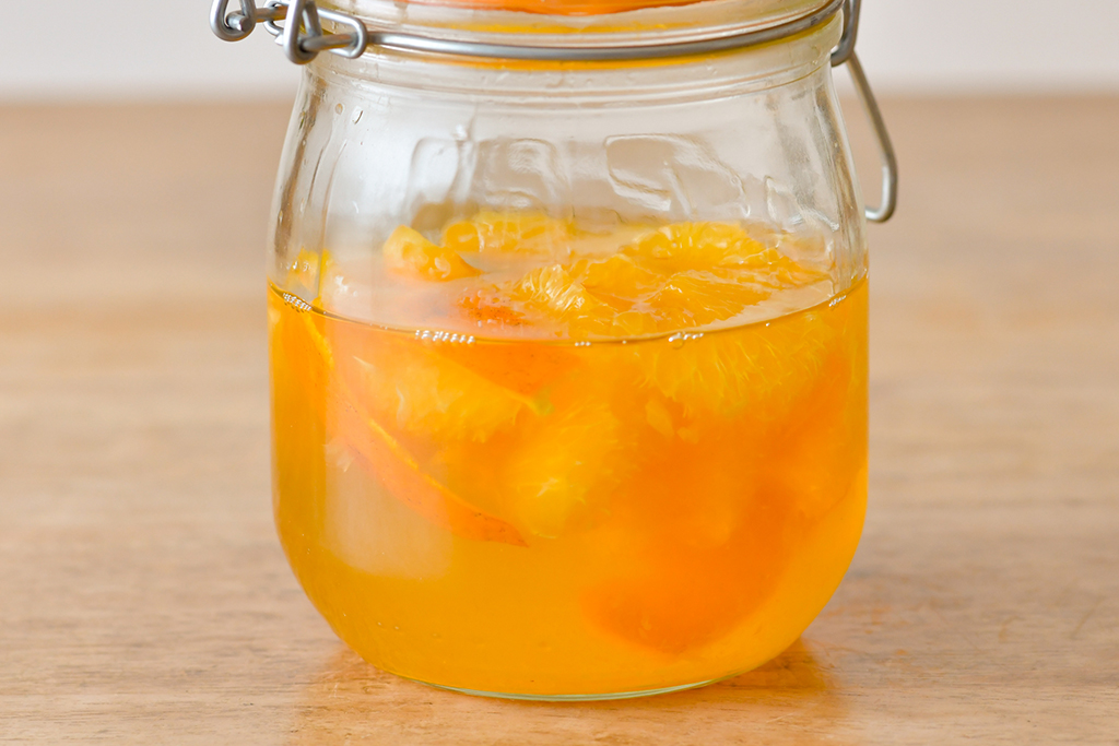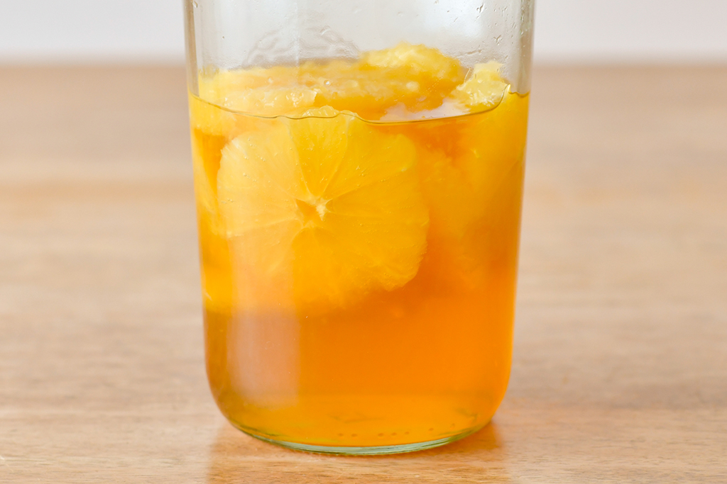 3.瓶にグレープフルーツをすべて入れ、アガペシロップを全量加えたら、白ワインビネガーを注ぎ、そのまま常温保存。1日に1回程度ゆすることで、材料を馴染ませる。5~7日ほどで完成。