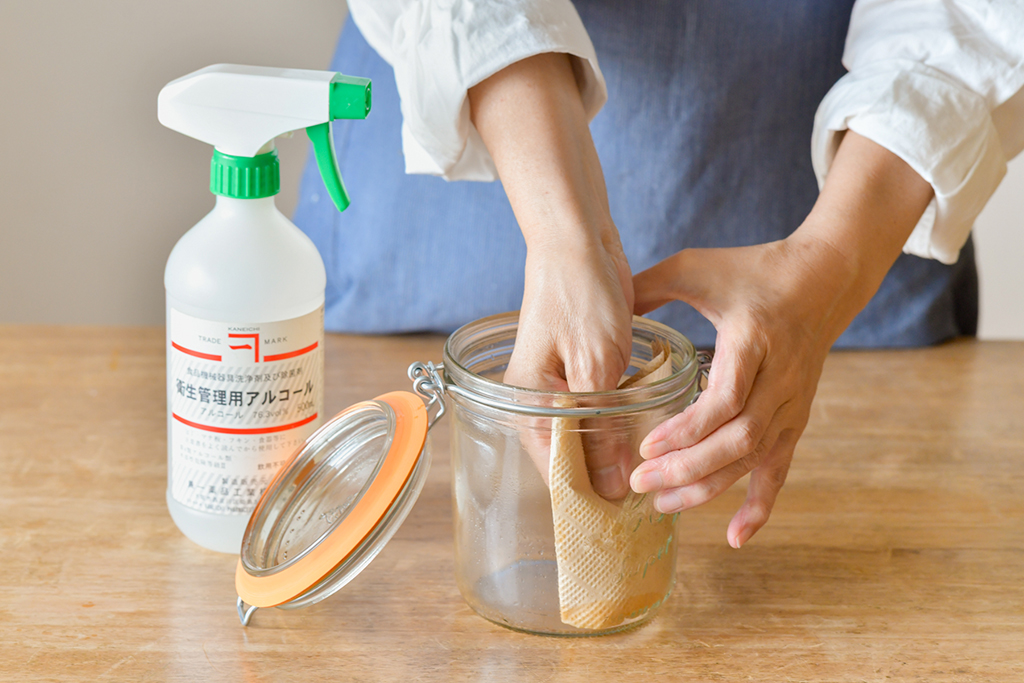 1.しっかり乾いたきれいな瓶全体にアルコールを噴きかけ、キッチンペーパーで拭く。