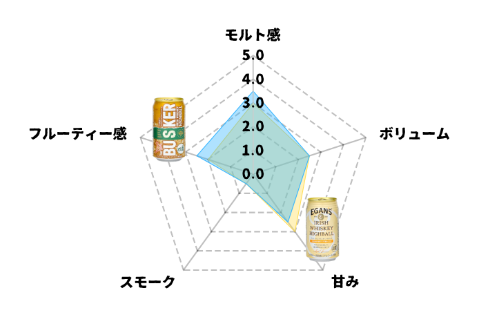 比べるのは、同じく原酒+炭酸水でシンプルに調合された、アルコール成分8%のアイリッシュハイボール缶『イーガンズ』。やはり、お国柄を感じさせるスムースな飲みごたえですが、こちらはややクリーミーで甘やか。『バスカーハイボール』のほうが、ほんのりフルーティーさを感じます。 液体の色は『バスカーハイボール』のほうが濃いですが、味の濃さはほぼ同じ。