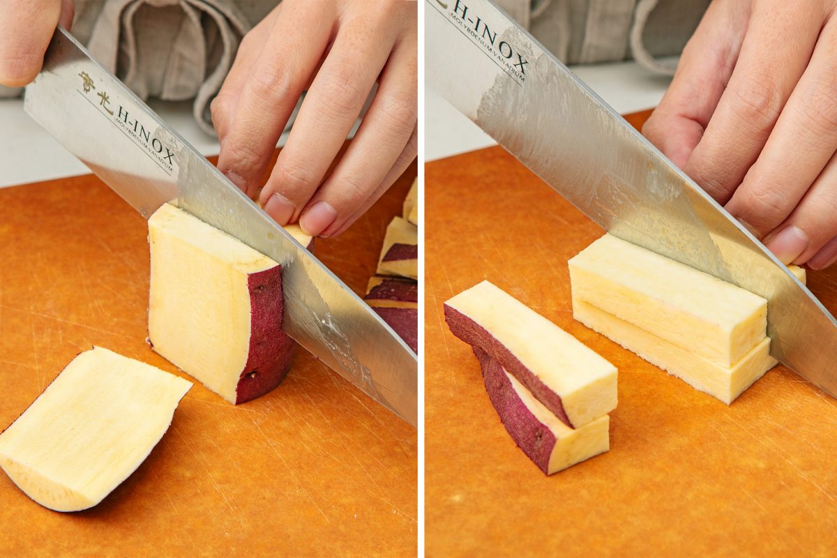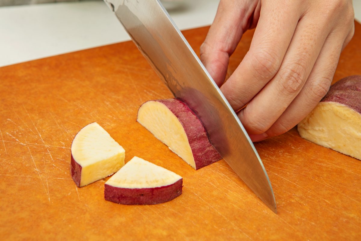 1. さつまいもは1㎝幅のいちょう切りに、ベーコンは1㎝幅に切る。にんにくは皮を剥く。