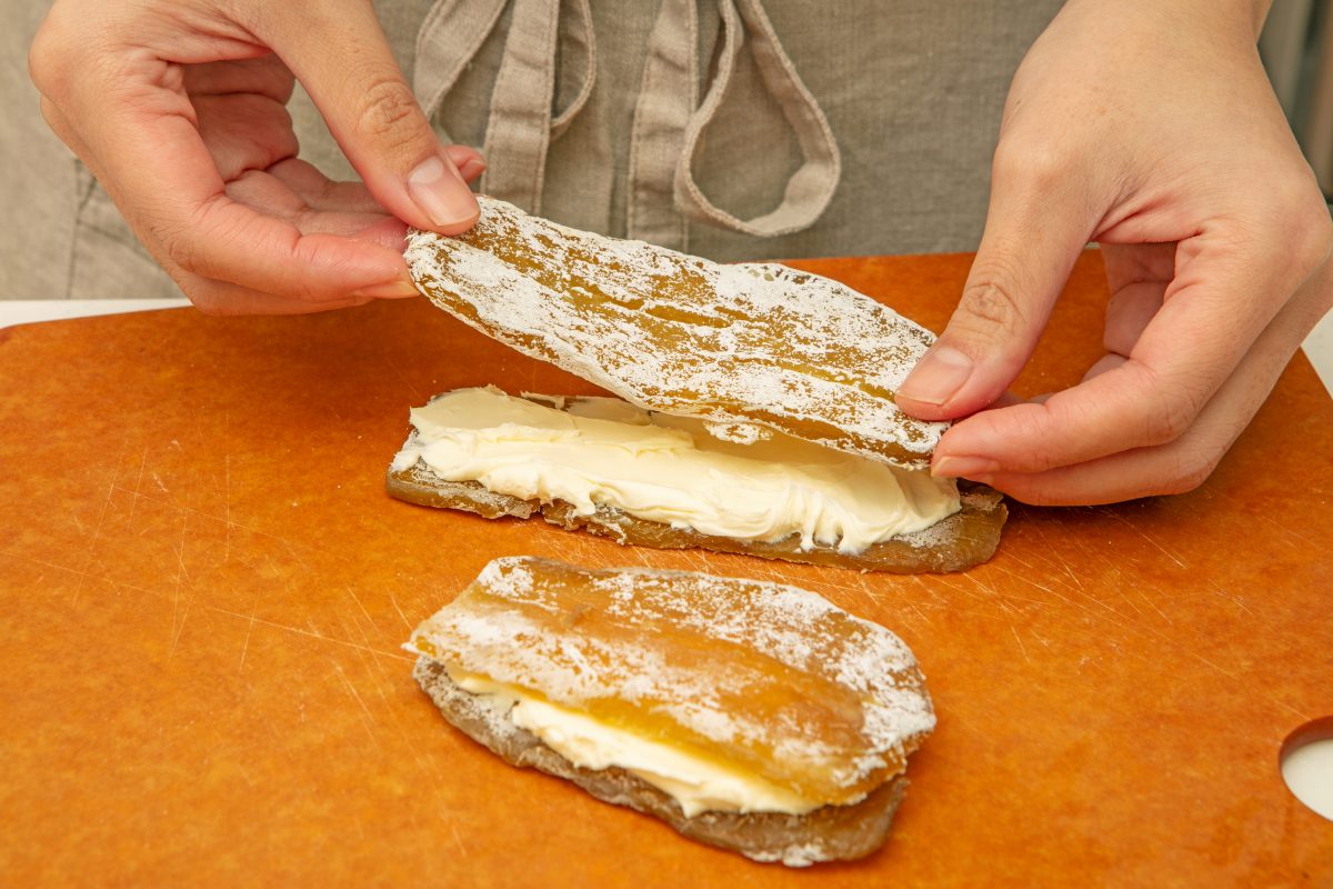 1. 干し芋にクリームチーズを塗り、その上に干し芋を重ねる。