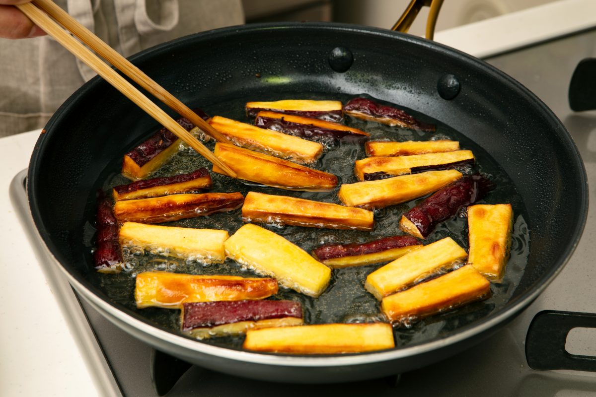 2. フライパンに油を入れて熱する。菜箸を入れたときに細かい泡が出るくらいまで熱したら、さつまいもを並べて揚げ焼きにする。