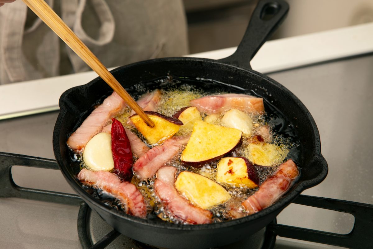 2. 小さめのフライパンにオリーブオイルとさつまいも、厚切りベーコン、にんにく、唐辛子を入れて中火で熱する。グツグツしてきたら弱火にし、10分煮る。