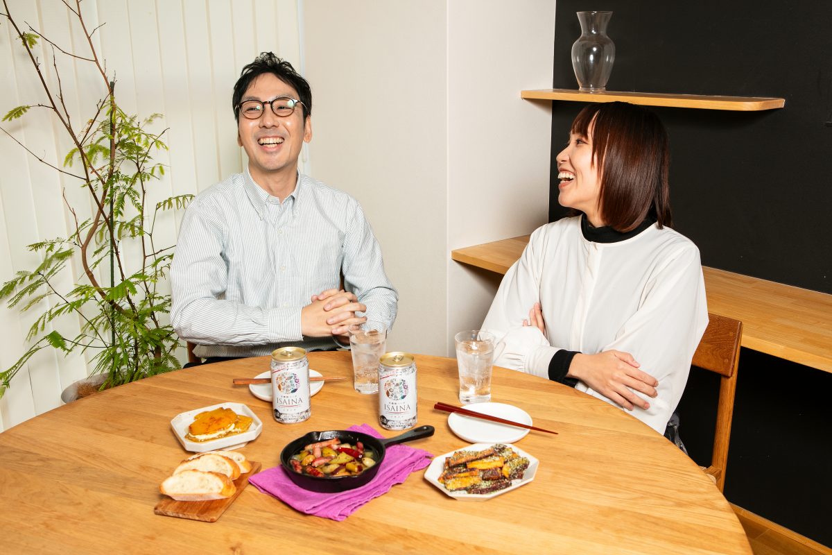 ふたりとも「『ISAINA』芋焼酎ソーダ5% 350ml」を初めて飲んだとき、そのフルーティで爽快な味わいに驚いたと言います。